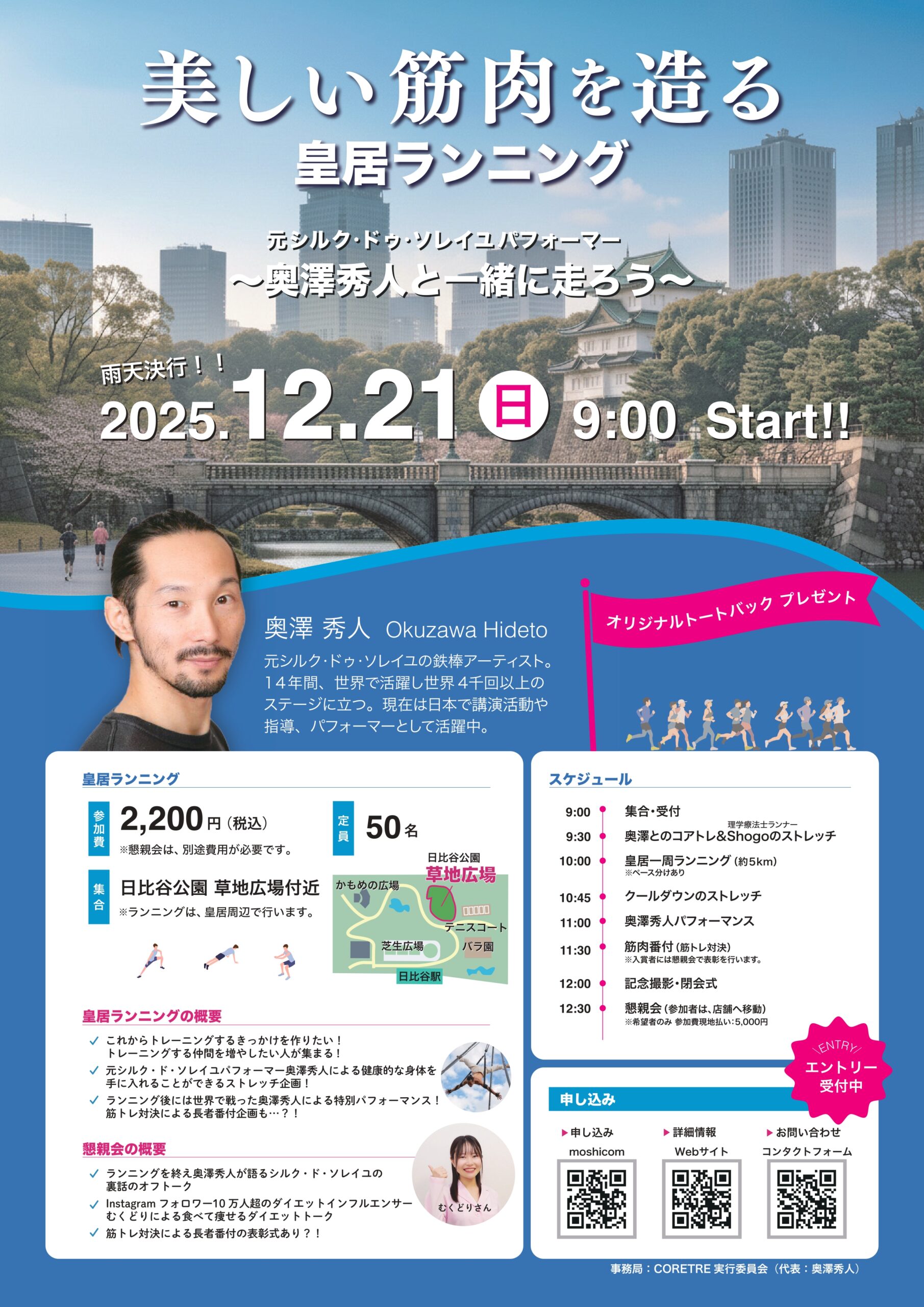 奥澤は文化芸術・現代サーカスの魅力をより多くの人に届けるため、国内外での公演活動を行うと同時に、未来ある子どもたちや若者たちに夢と希望を伝える講演活動を実施しています。奧澤自身の経験と怪我の乗り越えをもとにし、一般の方からアスリートまで、多くの方の身体作りをサポートしています。